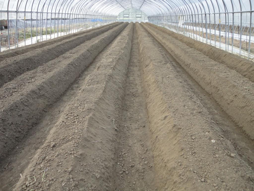 土耕栽培のハウスは、まずハウス内の土を耕し、このように