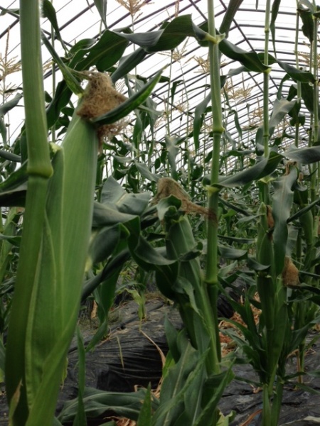土耕栽培のいちごを4月に撤去して、そこにとうもろこしの種をまいて栽培したもの。
